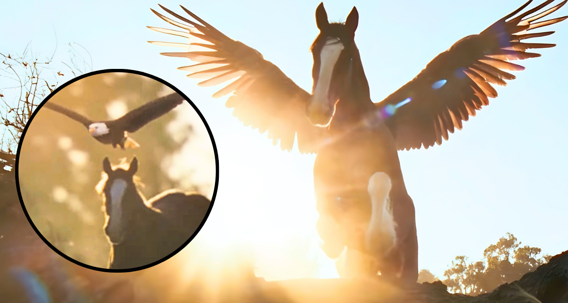 Then comes the moment viewers can’t stop talking about. As the now-grown Clydesdale clears a fallen tree, sunlight pours in behind it, revealing massive wings stretched across its back. For a brief, breathtaking instant, the horse appears almost mythical—before the fully grown bald eagle emerges and takes flight. It’s not just visually striking; it’s symbolic, hopeful, and undeniably emotional.